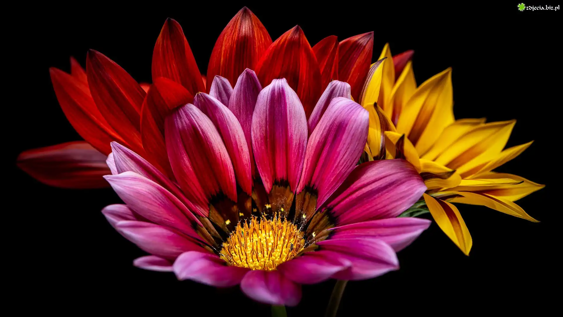 Zdjęcie Kwiaty, Kolorowe, Stokrotki afrykańskie, Czarne, Tło