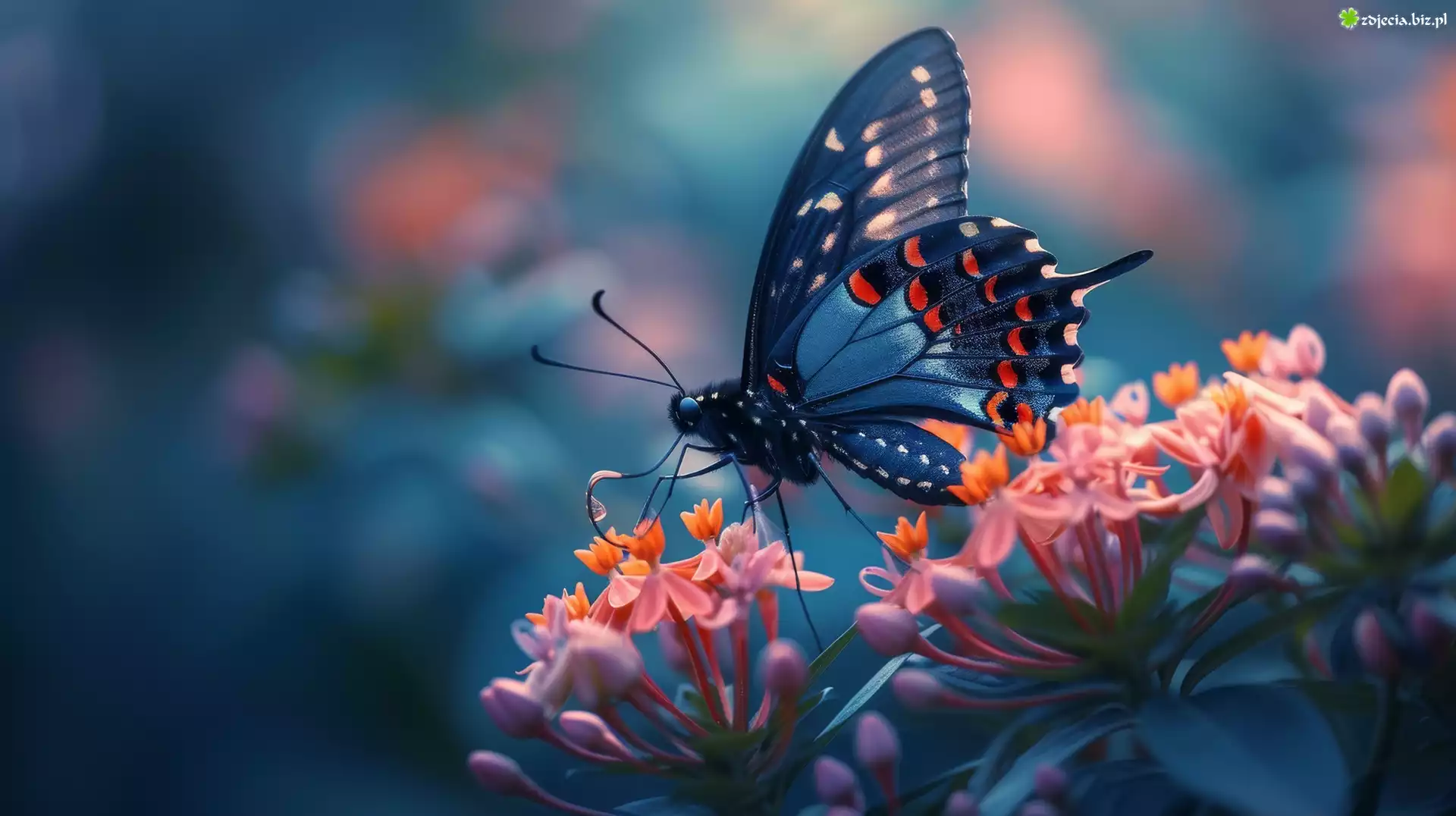 Zdjęcie Różowe, Kwiaty, Czarno-niebieski, Motyl, Grafika