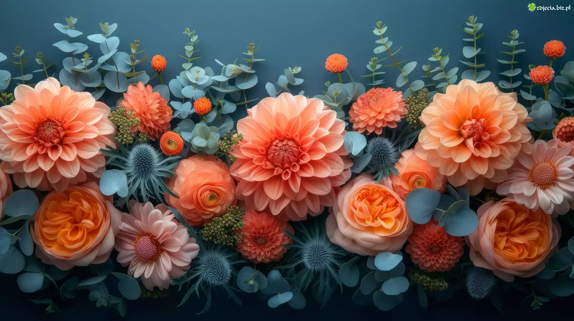 Zdjęcie Pomarańczowe, Kwiaty, Dalie, Liście, Kompozycja