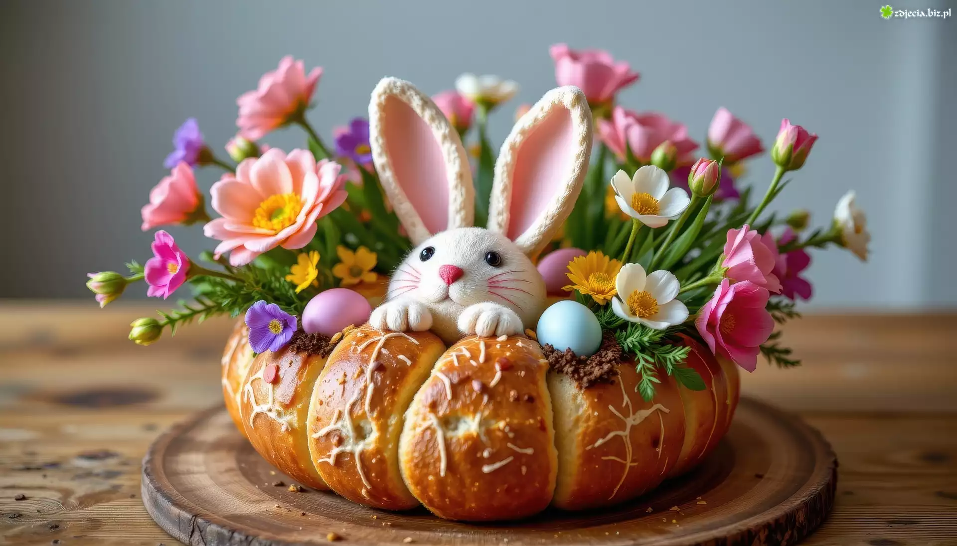 Zdjęcie Wielkanoc, Chleb, Królik, Kwiaty, Jajka, Deska