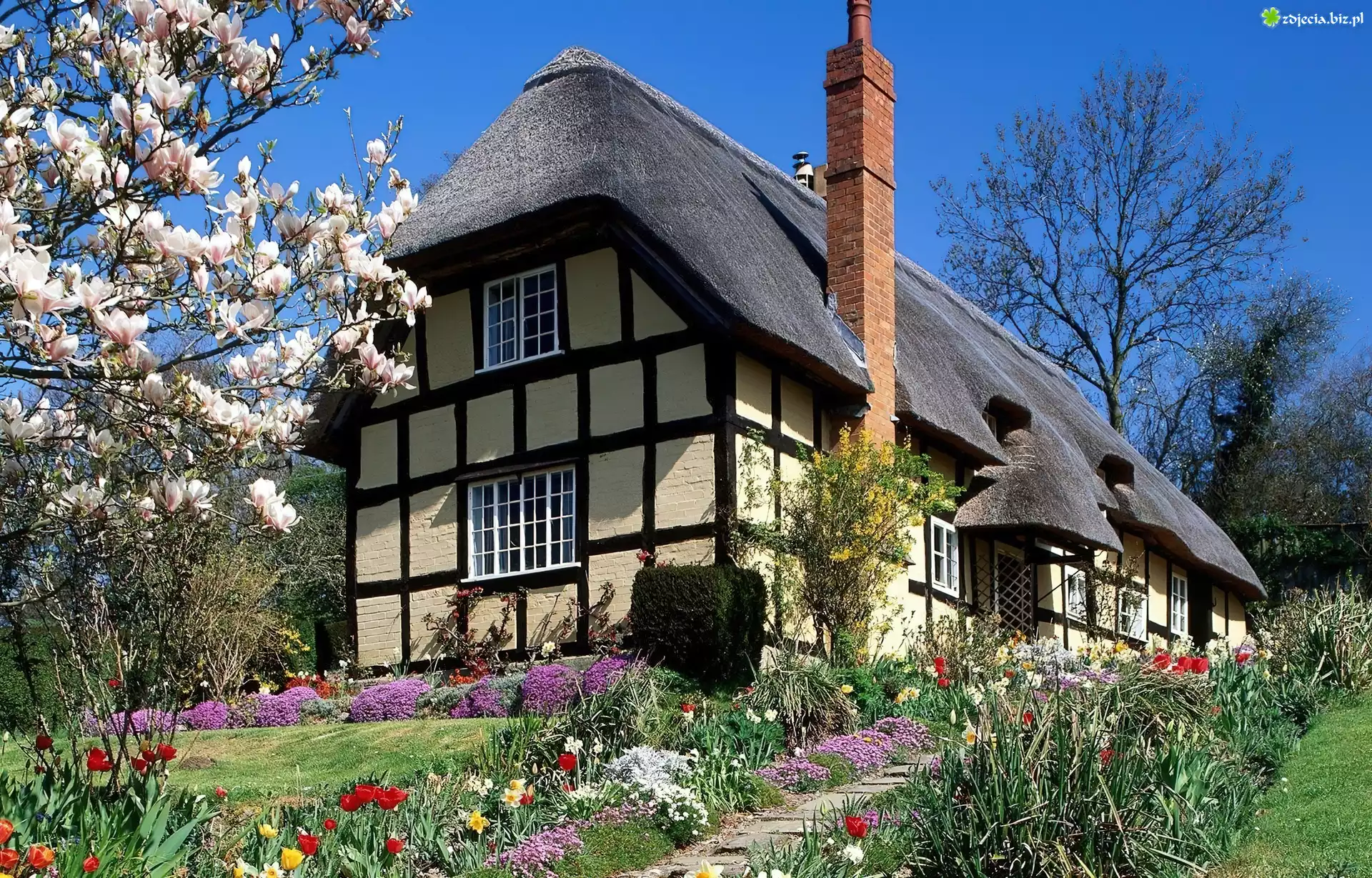 Zdjęcie Domek, Kwiaty, Drzewa