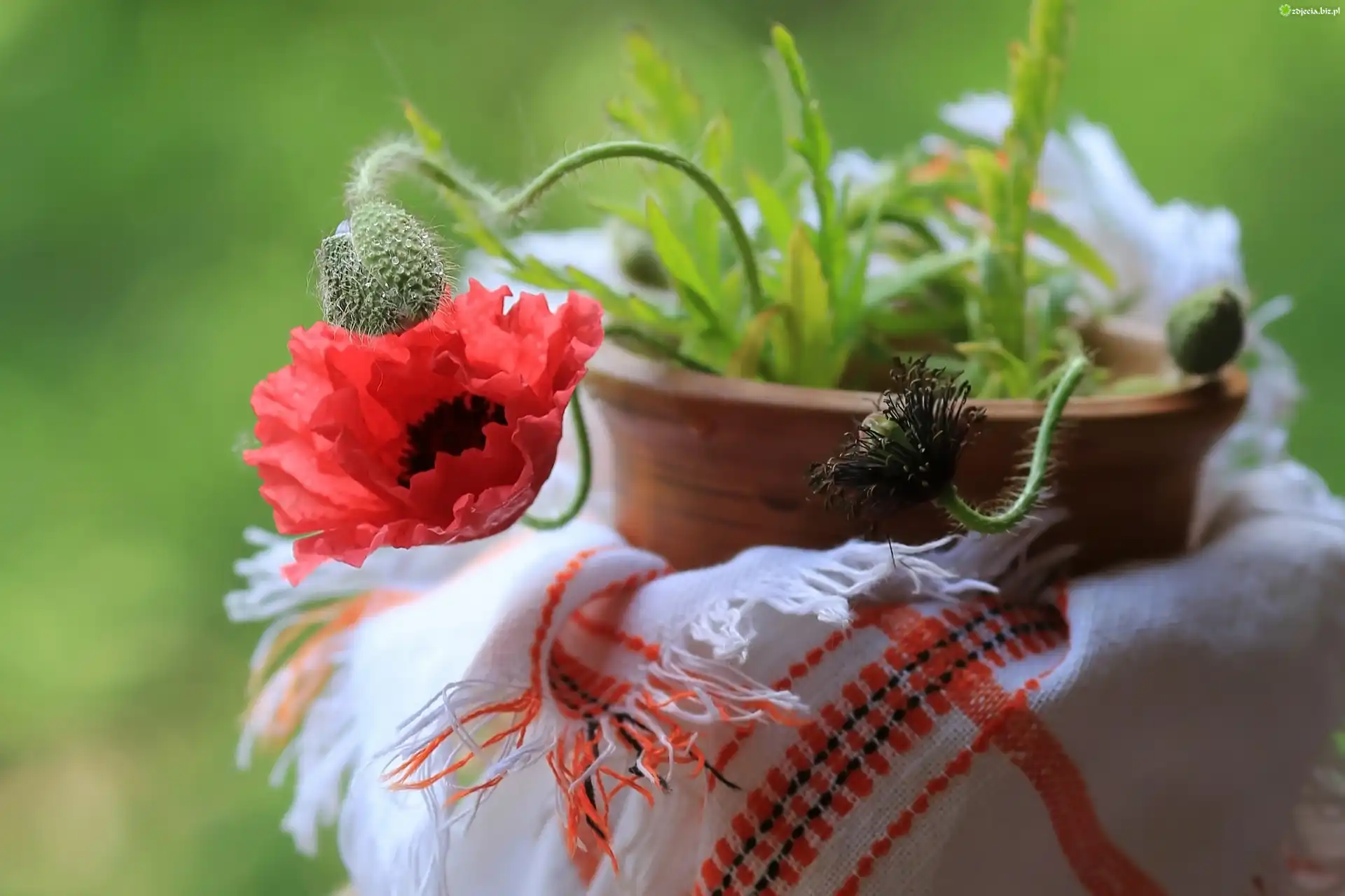 Zdjęcie, Kwiaty, Maki, Pąki, Donica, Serweta