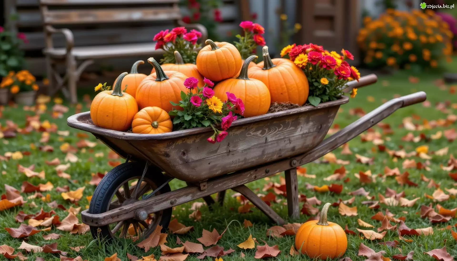 Zdjęcie Drewniana, Taczka, Dynie, Kwiaty