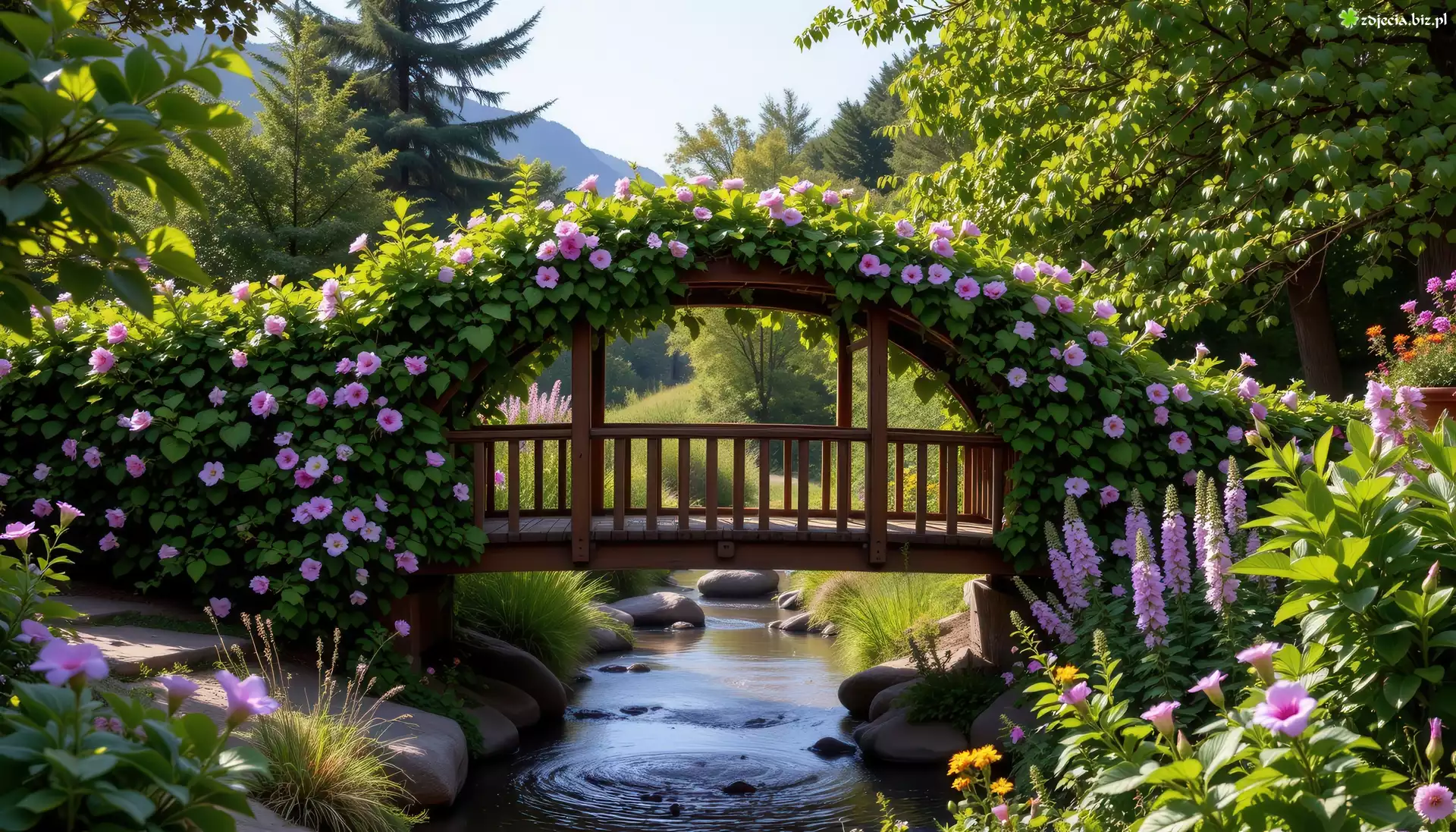 Zdjęcie Drewniany, Mostek, Strumień, Kwiaty