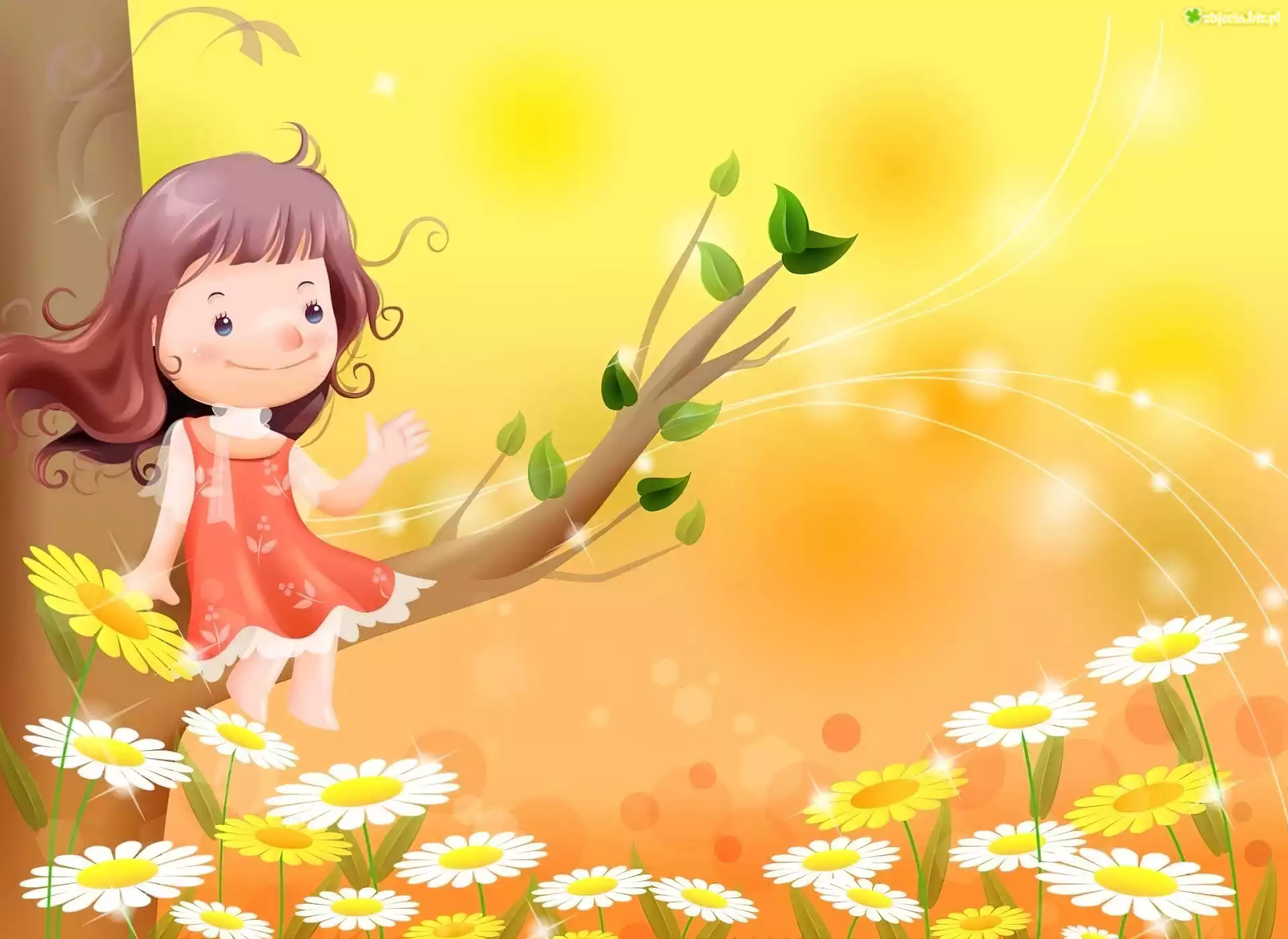 Zdjęcie Kwiaty, Stokrotki, Drzewo, Dziewczynka