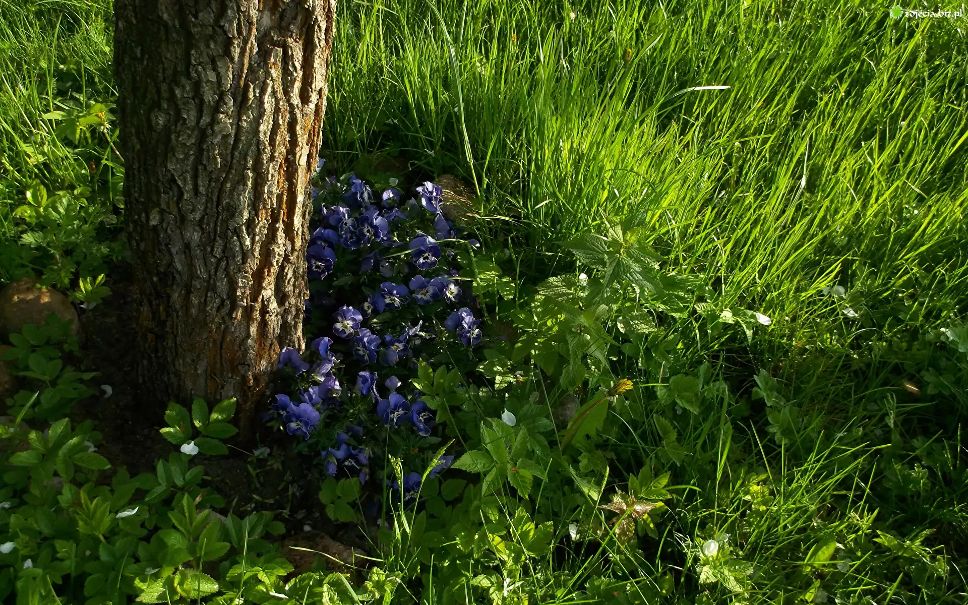 Zdjęcie, Kwiaty, Fiołki trójbarwne, Pień, Drzewo, Trawa