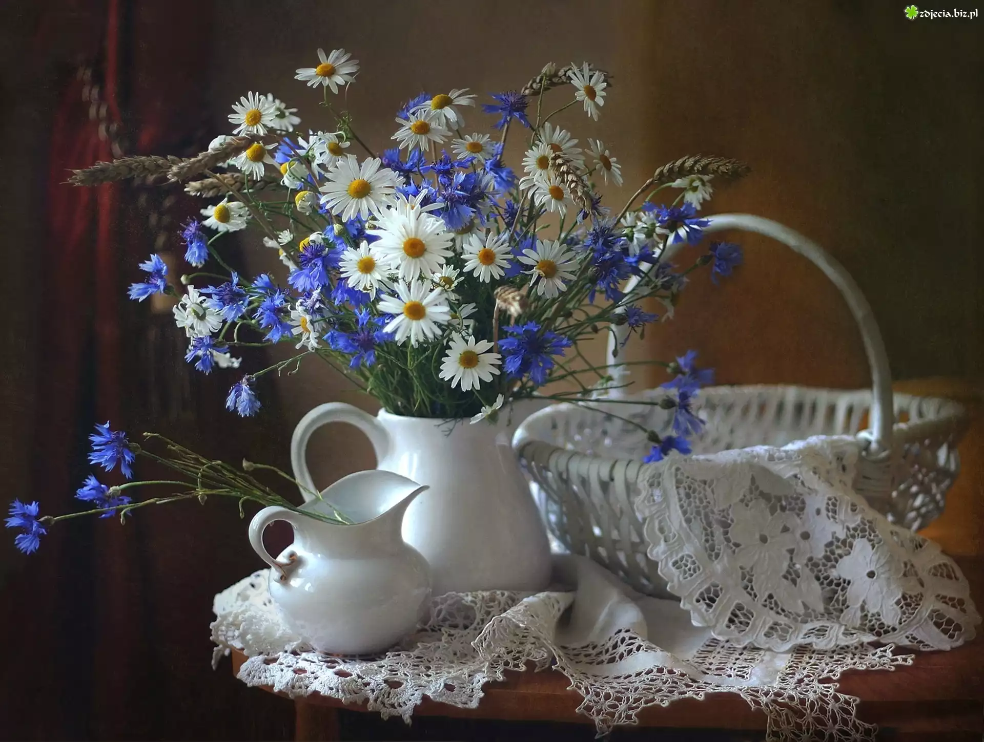 Zdjęcie Kwiaty, Kosz, Margerytki, Dzbanki, Chabry