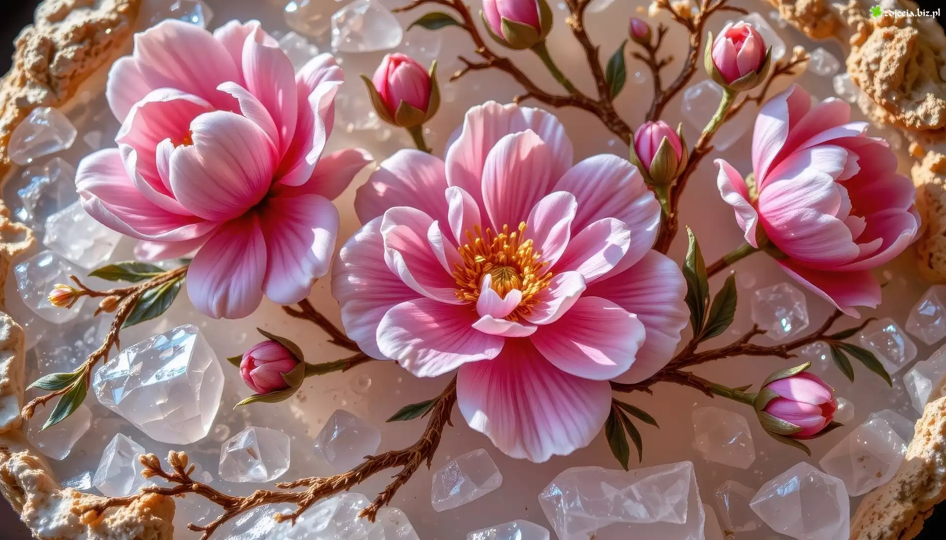 Zdjęcie Różowe, Kwiaty, Gałązki, Pąki, Kryształy