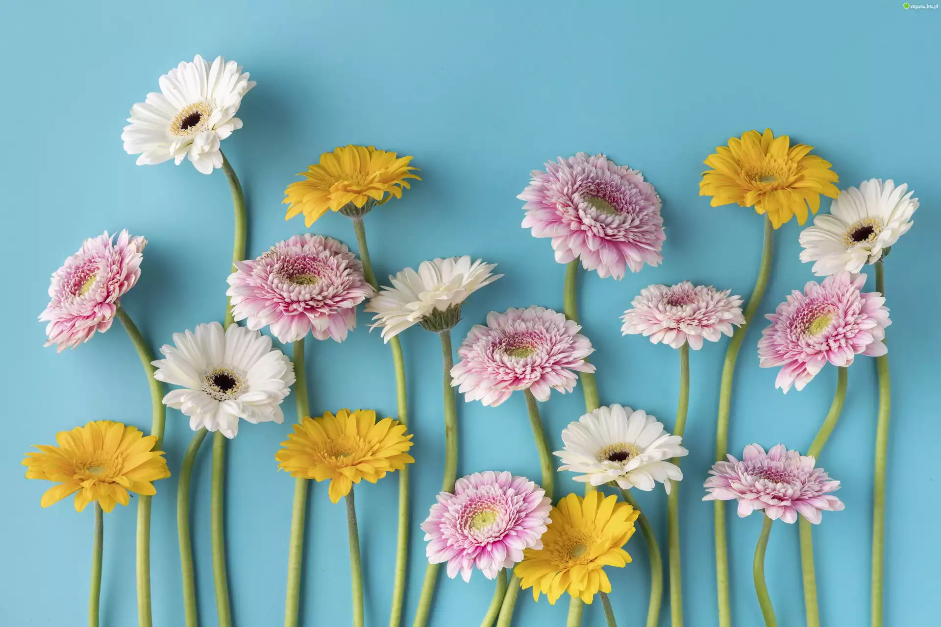 Zdjęcie Kolorowe, Kwiaty, Gerbery, Niebieskie, Tło