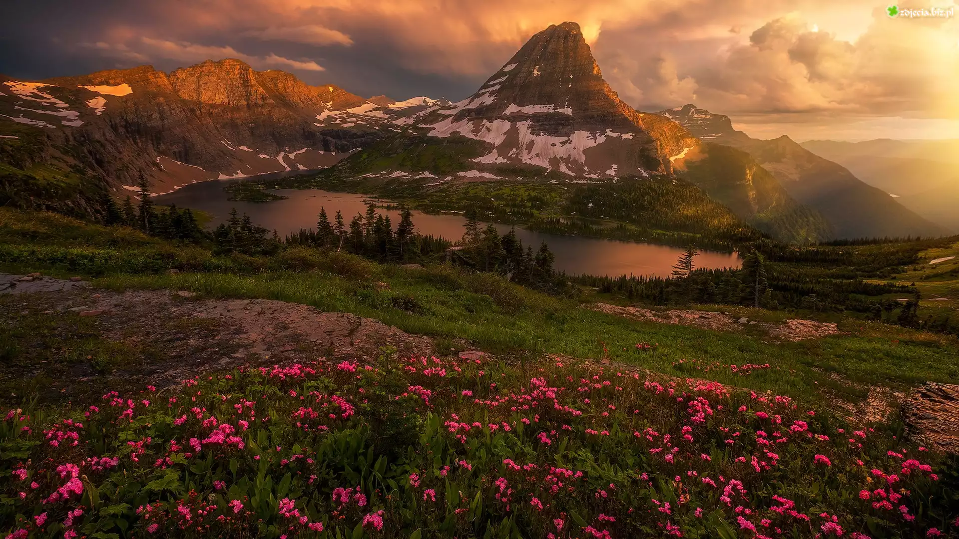Zdjęcie Góry, Lewis Range, Jezioro, Hidden Lake, Łąka, Kwiaty, Chmury, Park Narodowy Glacier, Montana, Stany Zjednoczone |