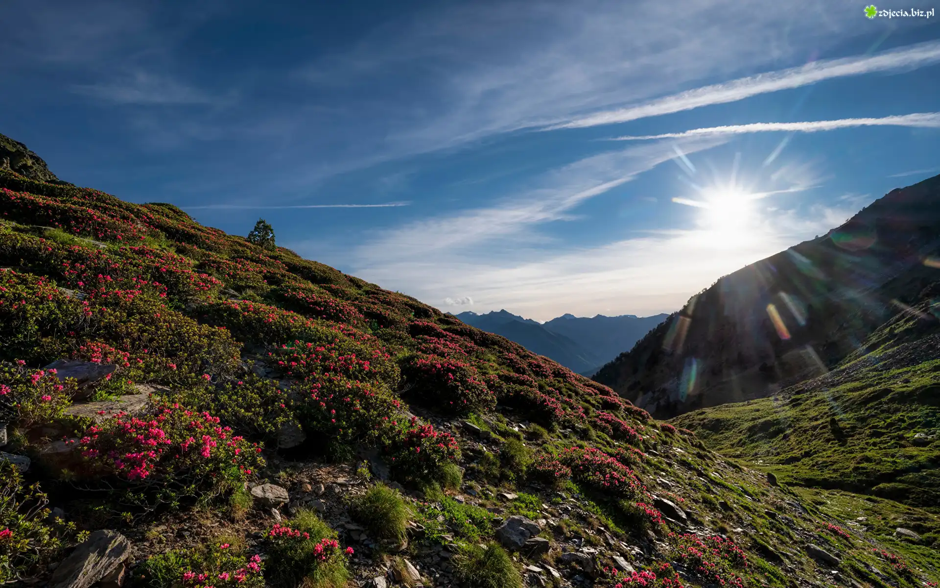 Zdjęcie Góry, Pireneje, Wschód słońca, Kwiaty, Łąka, Roślinność, Park Narodowy Vall de Sorteny, Ordino, Andora |