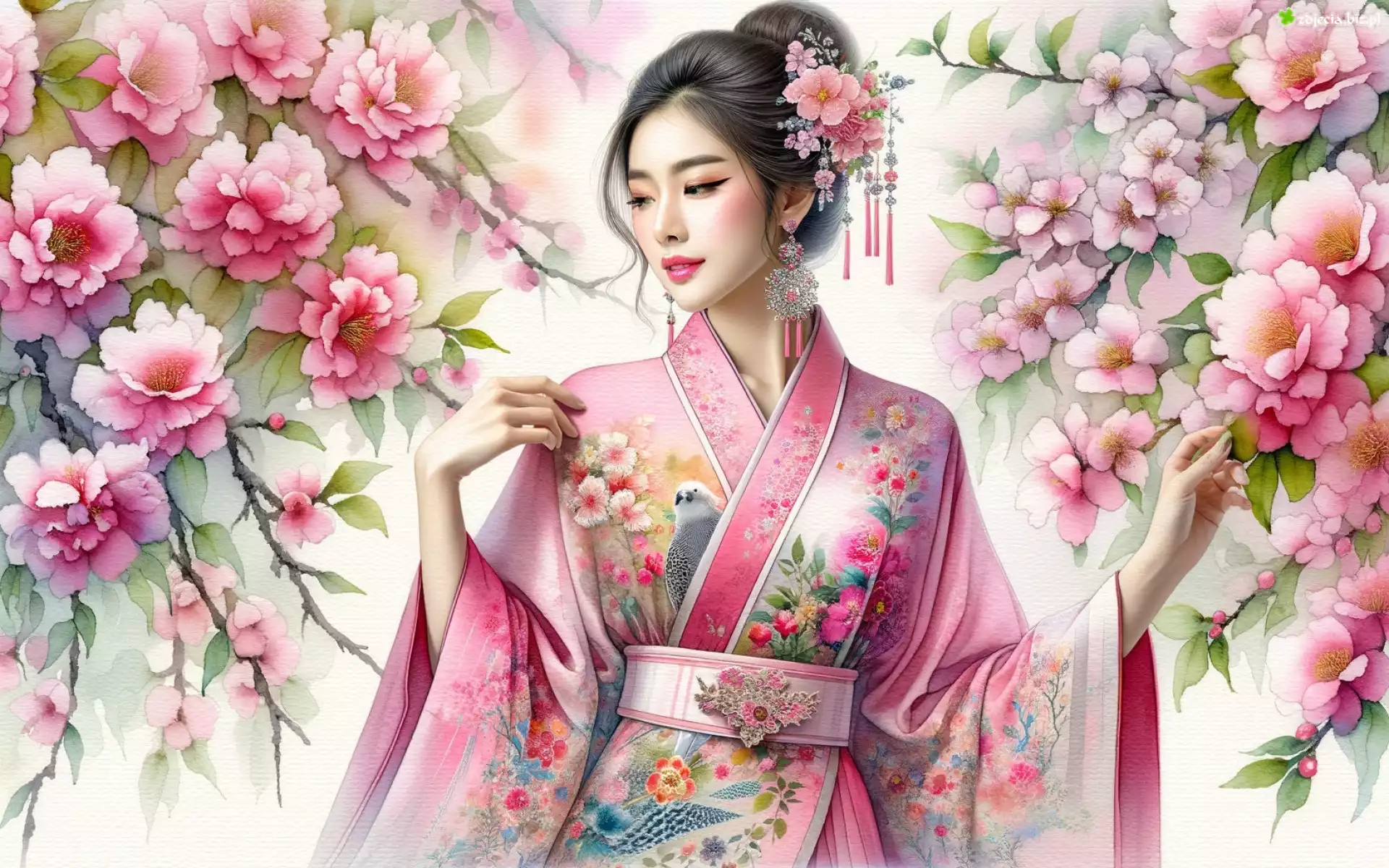 Zdjęcie Kobieta, Gejsza, Kimono, Kwiaty, Gałęzie, Grafika