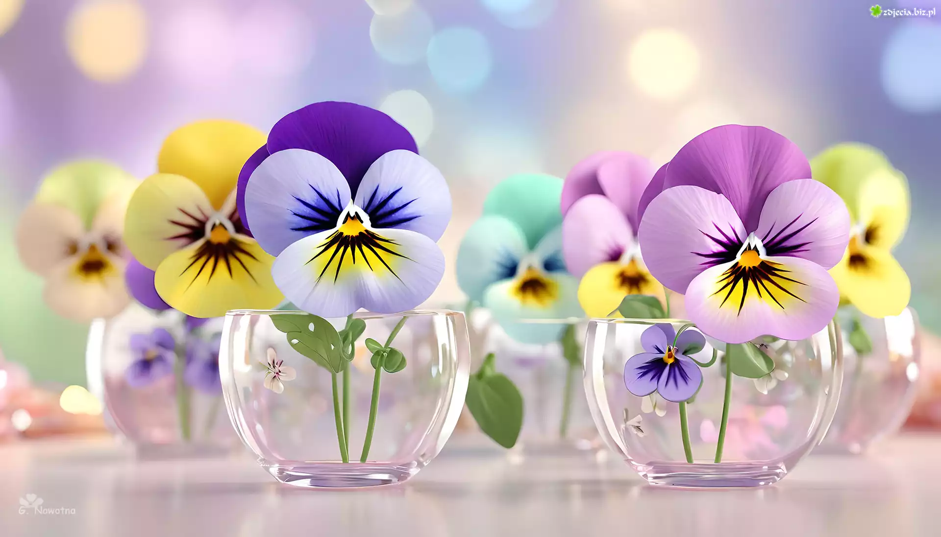 Zdjęcie Bratki, Kwiaty, Grafika, Szklane, Naczynia