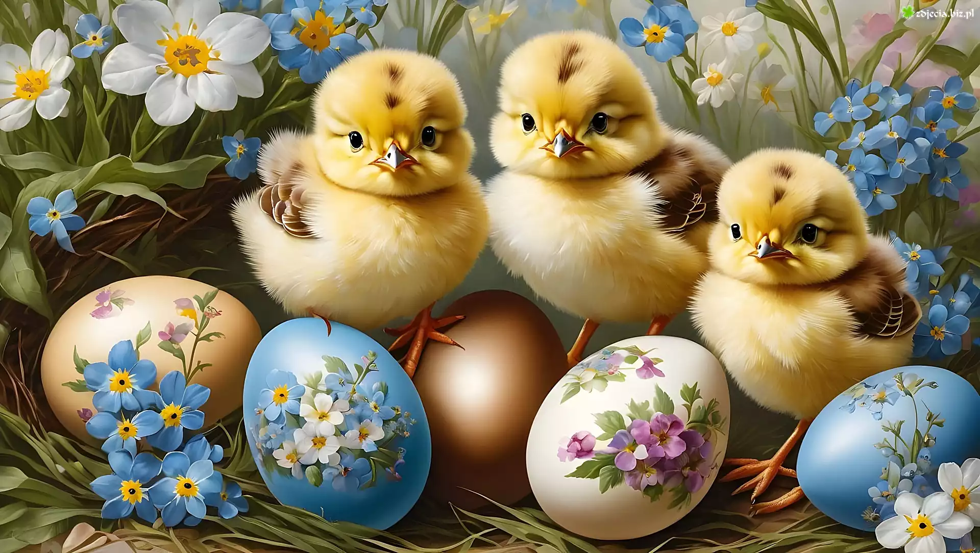 Zdjęcie, Kurczęta, Pisanki, Niebieskie, Kwiaty, Wielkanoc, Grafika