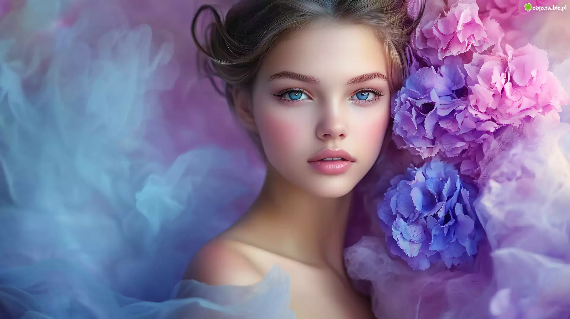 Zdjęcie Dziewczyna, Niebieskie, Oczy, Kwiaty, Hortensje, Grafika