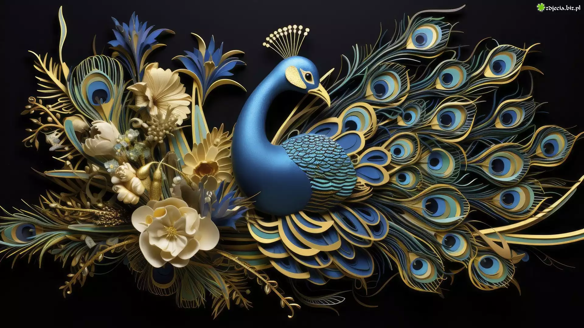 Zdjęcie Grafika, Ptak, Paw, Kwiaty