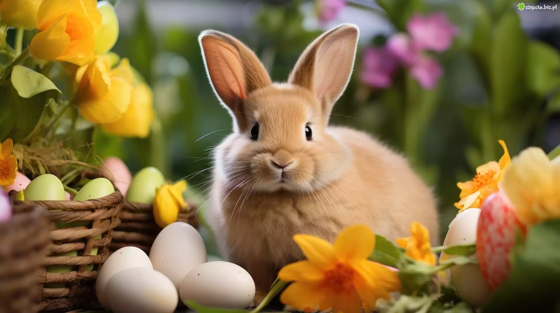 Zdjęcie Wielkanoc, Królik, Pisanki, Kwiaty, Koszyk, Grafika