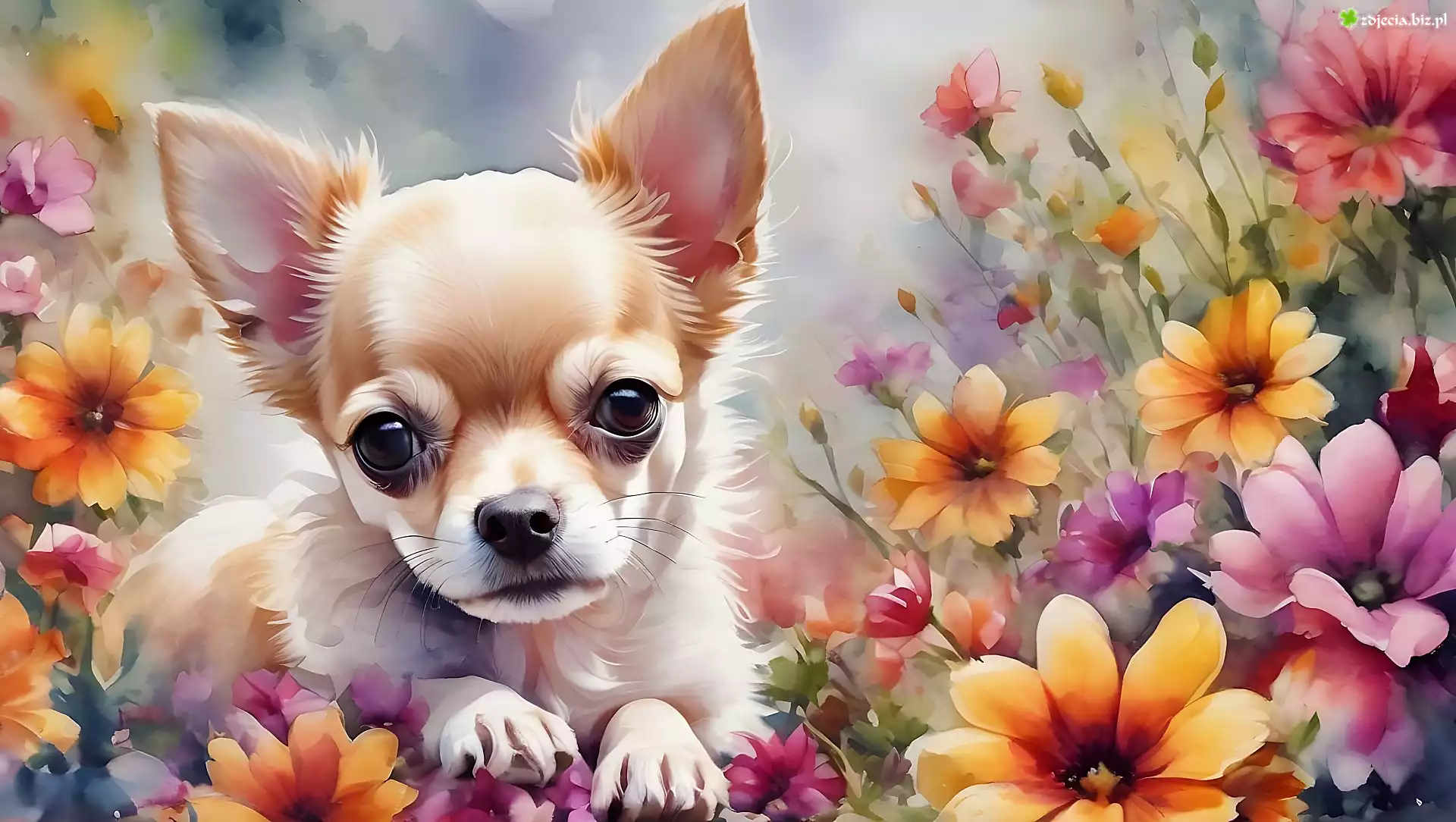 Zdjęcie Chihuahua, Pies, Szczeniak, Kwiaty, Akwarela, Grafika