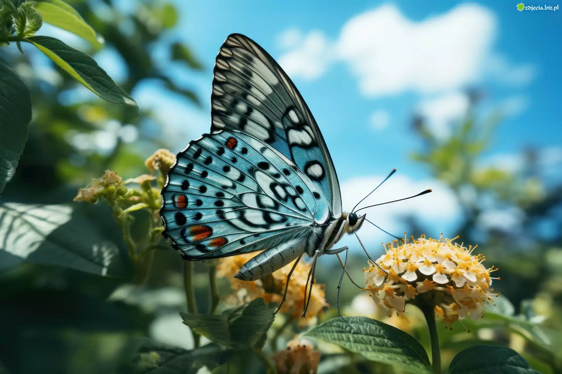 Zdjęcie Motyl, Niebieski, Żółte, Kwiaty, Niebo, Grafika