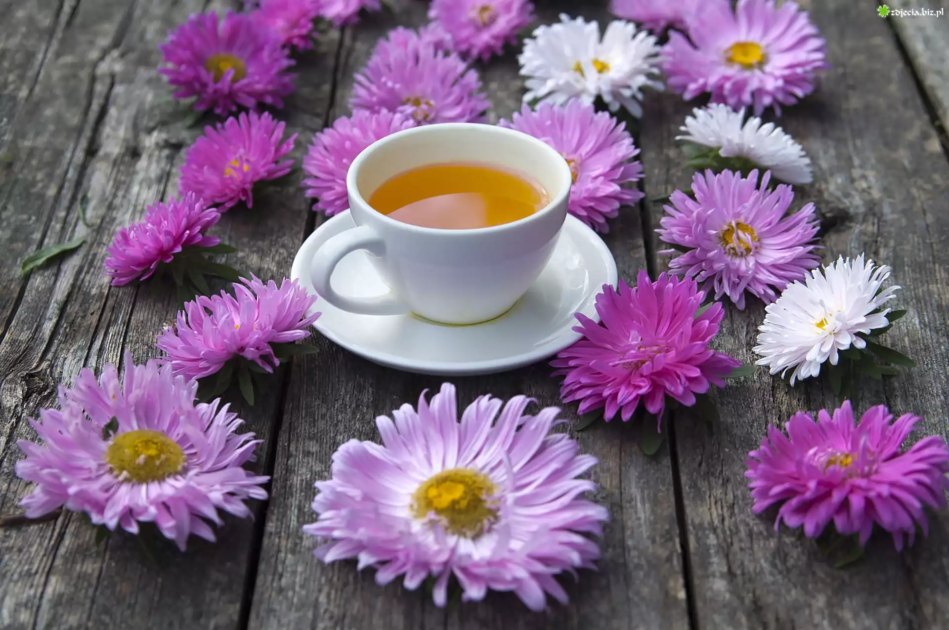 Zdjęcie, Kwiaty, Astry, Herbata, Filiżanka