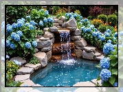Zdjęcie Ogród, Kwiaty, Hortensje, Kamienie, Kaskada