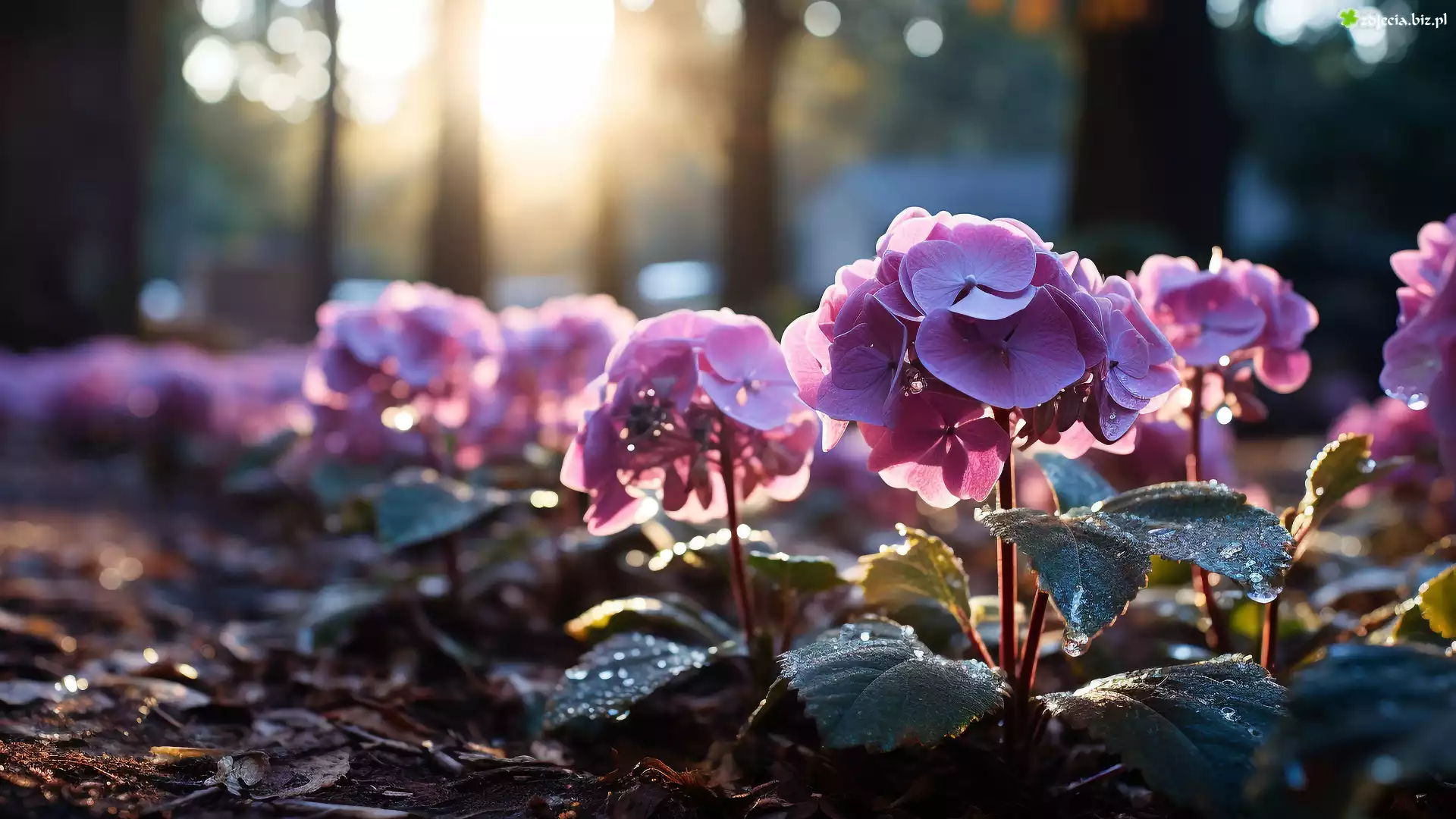 Zdjęcie, Fioletowe, Kwiaty, Hortensje, Listki, Krople