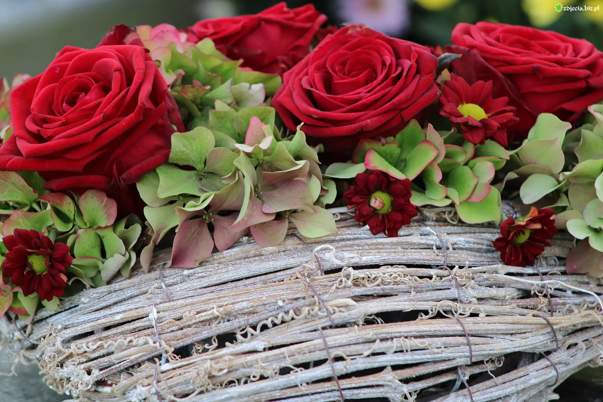 Zdjęcie, Kwiaty, Czerwone, Róże, Hortensje, Koszyk