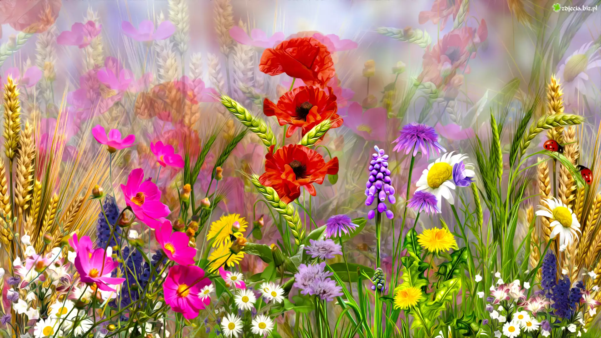 Zdjęcie Kwiaty, Maki, Kosmea, Zboże, Kłosy, Grafika