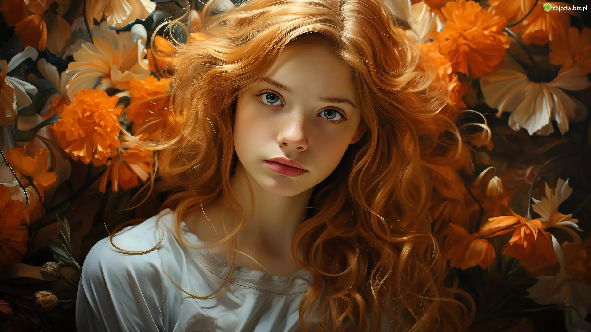 Zdjęcie Kobieta, Rudowłosa, Spojrzenie, Kwiaty
