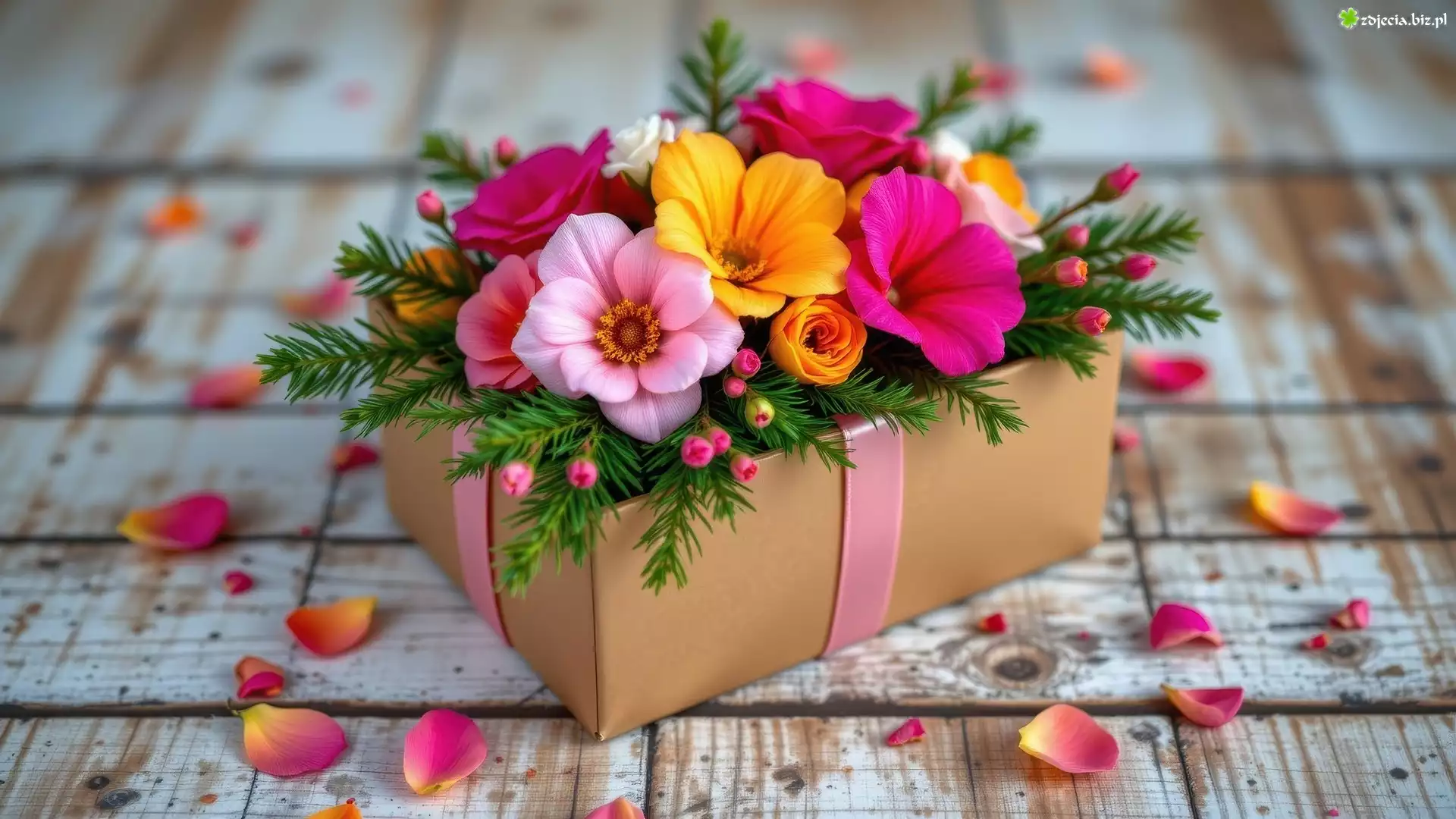 Zdjęcie Prezent, Wstążka, Kolorowe, Kwiaty, Płatki, Kwiatów, Deski