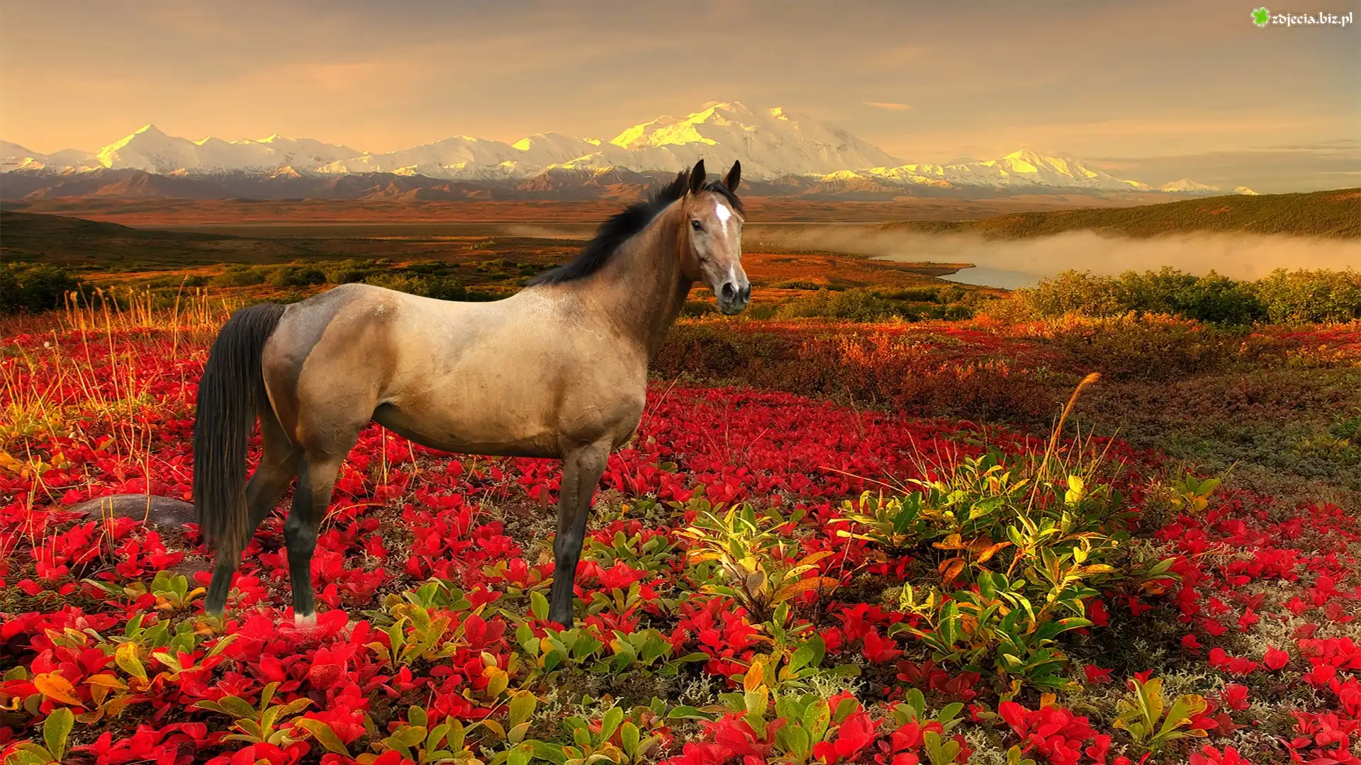 Zdjęcie Koń, Kwiaty, Góry