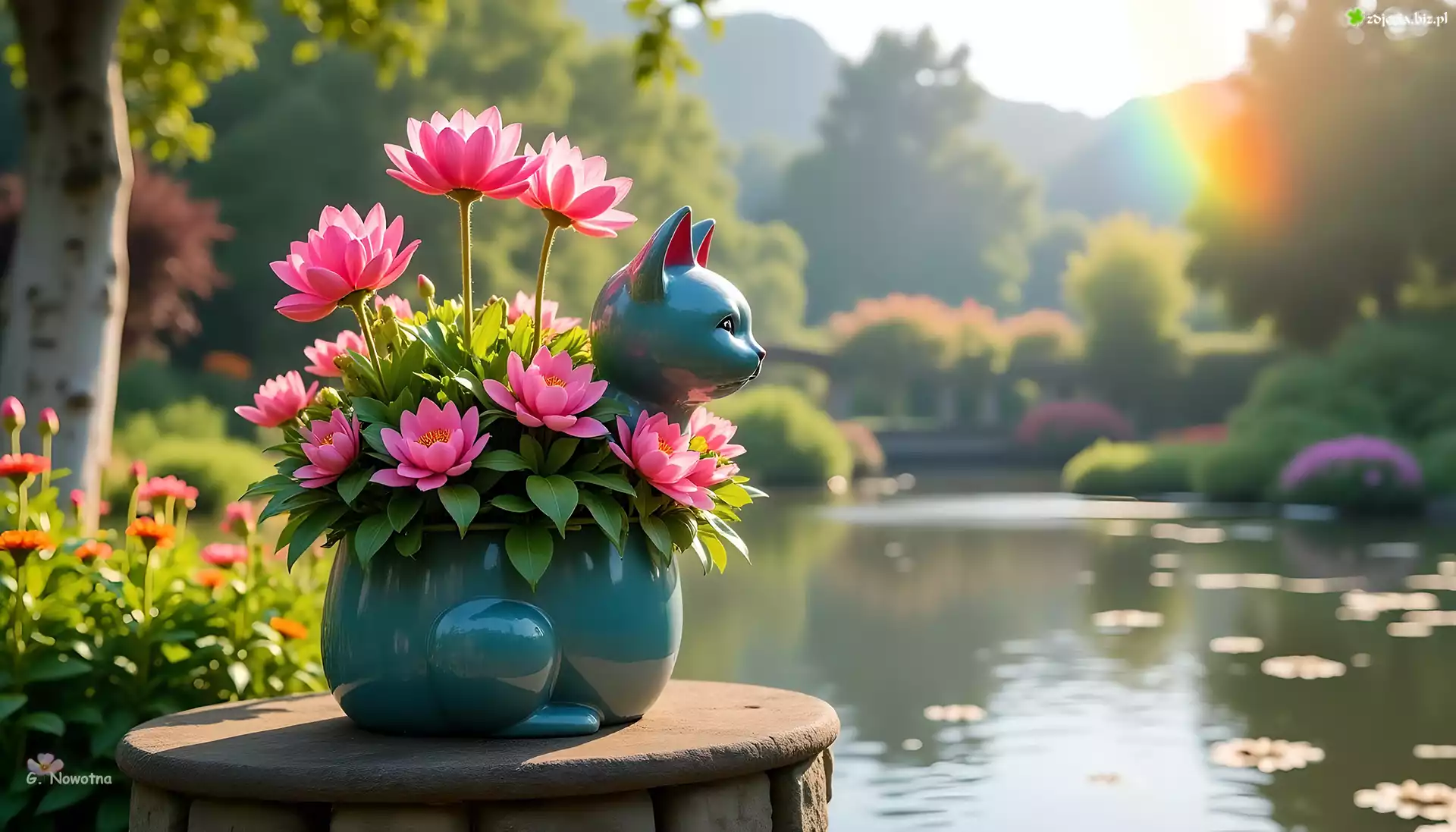 Zdjęcie Doniczka, Kwiaty, Kot, Jezioro, Grafika