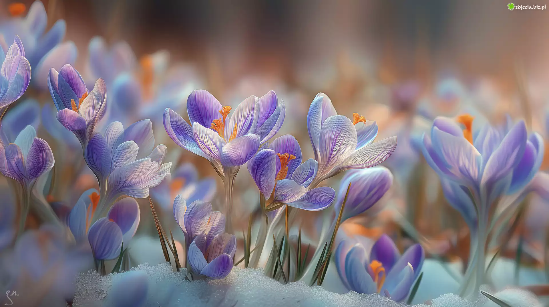 Zdjęcie Fioletowo-białe, Krokusy, Kwiaty, Śnieg, Grafika AI