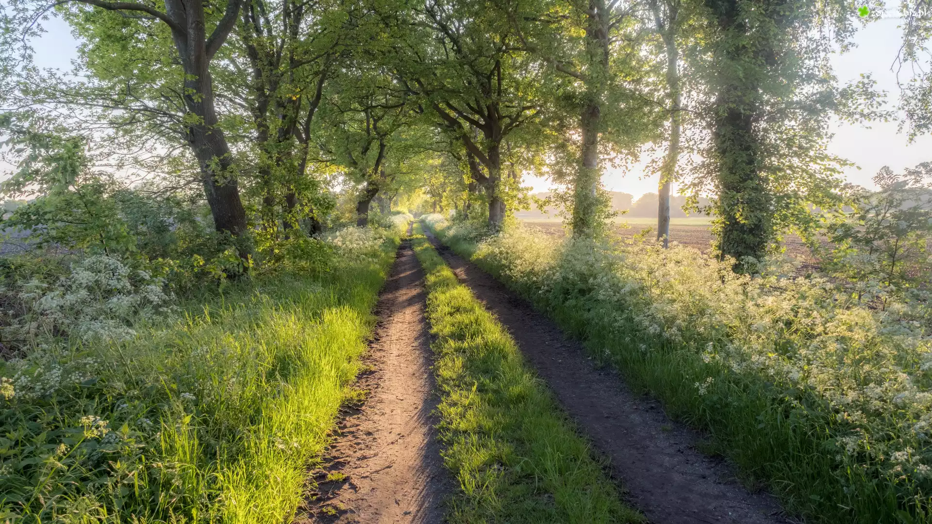 Zdjęcie Droga, Drzewa, Trawa, Kwiaty, Poranek, Lato