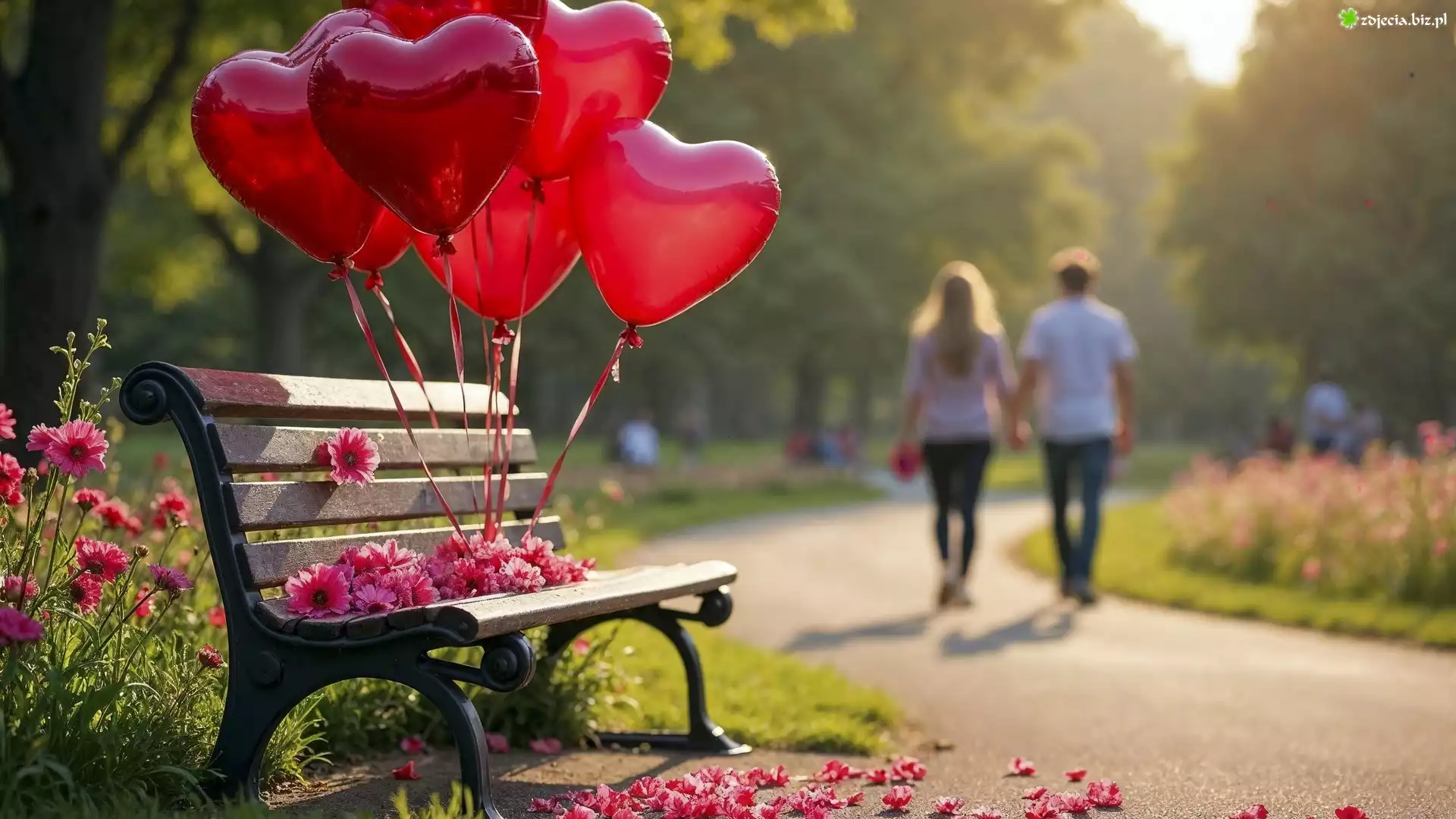 Zdjęcie Ławka, Czerwone, Balony, Kwiaty