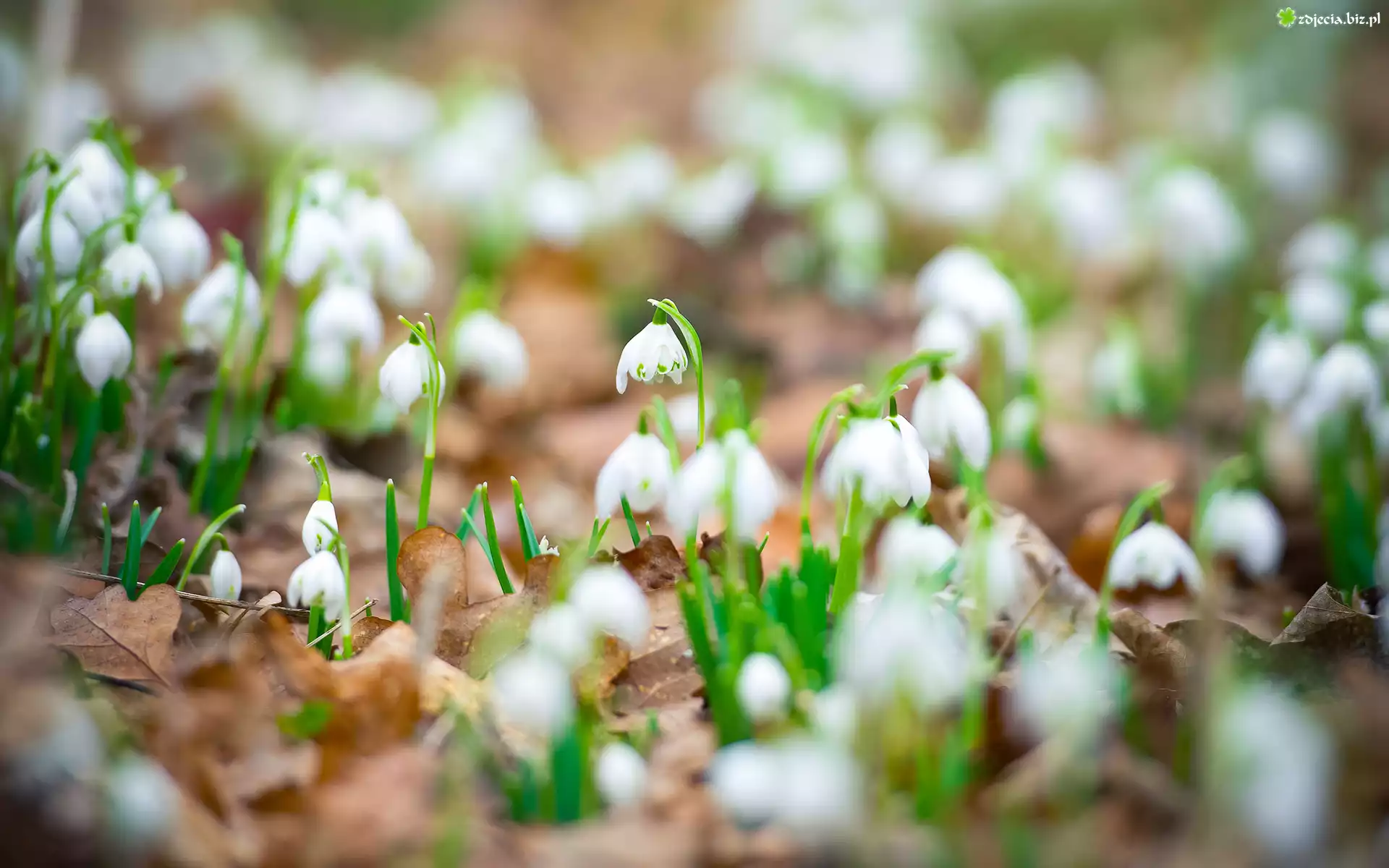 Zdjęcie, Kwiaty, Białe, Śnieżyce, Liście, Rozmycie