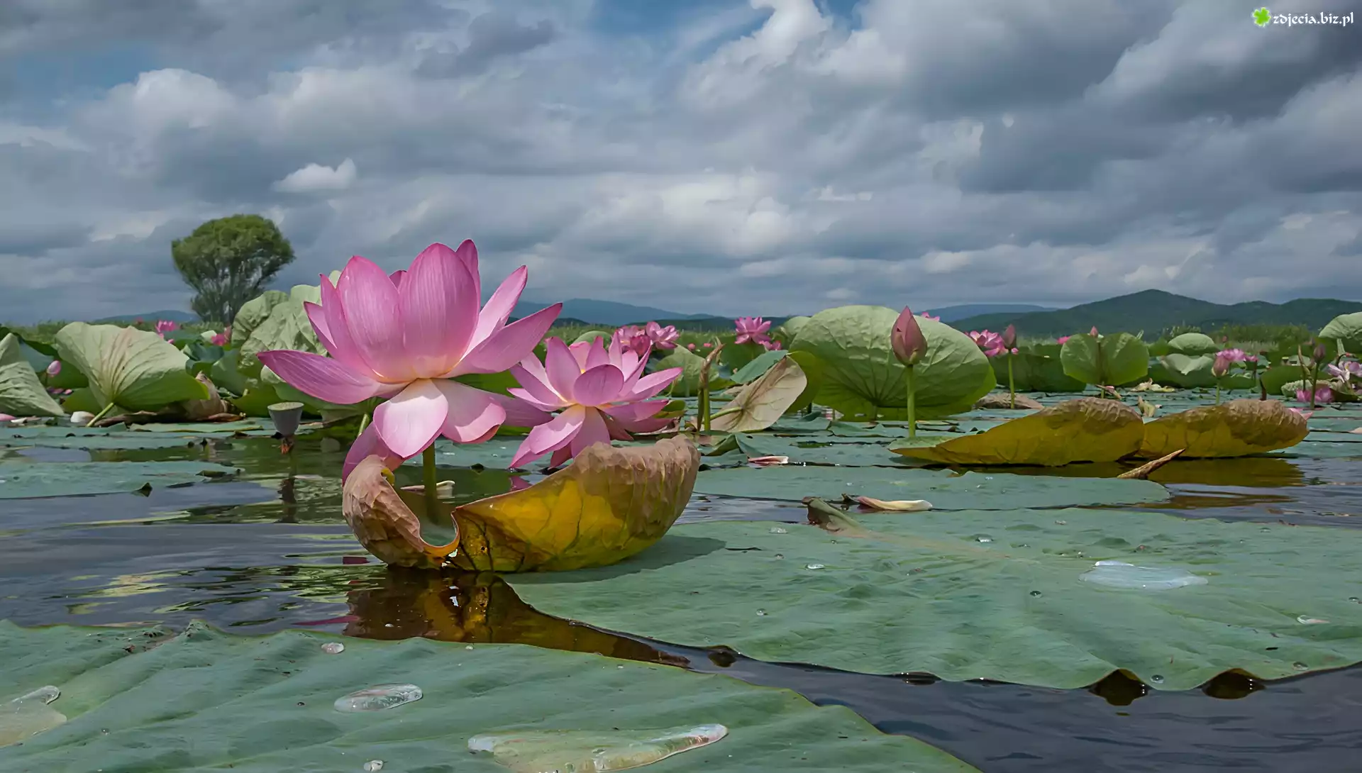 Zdjęcie, Kwiaty, Różowe, Lotosy, Liście