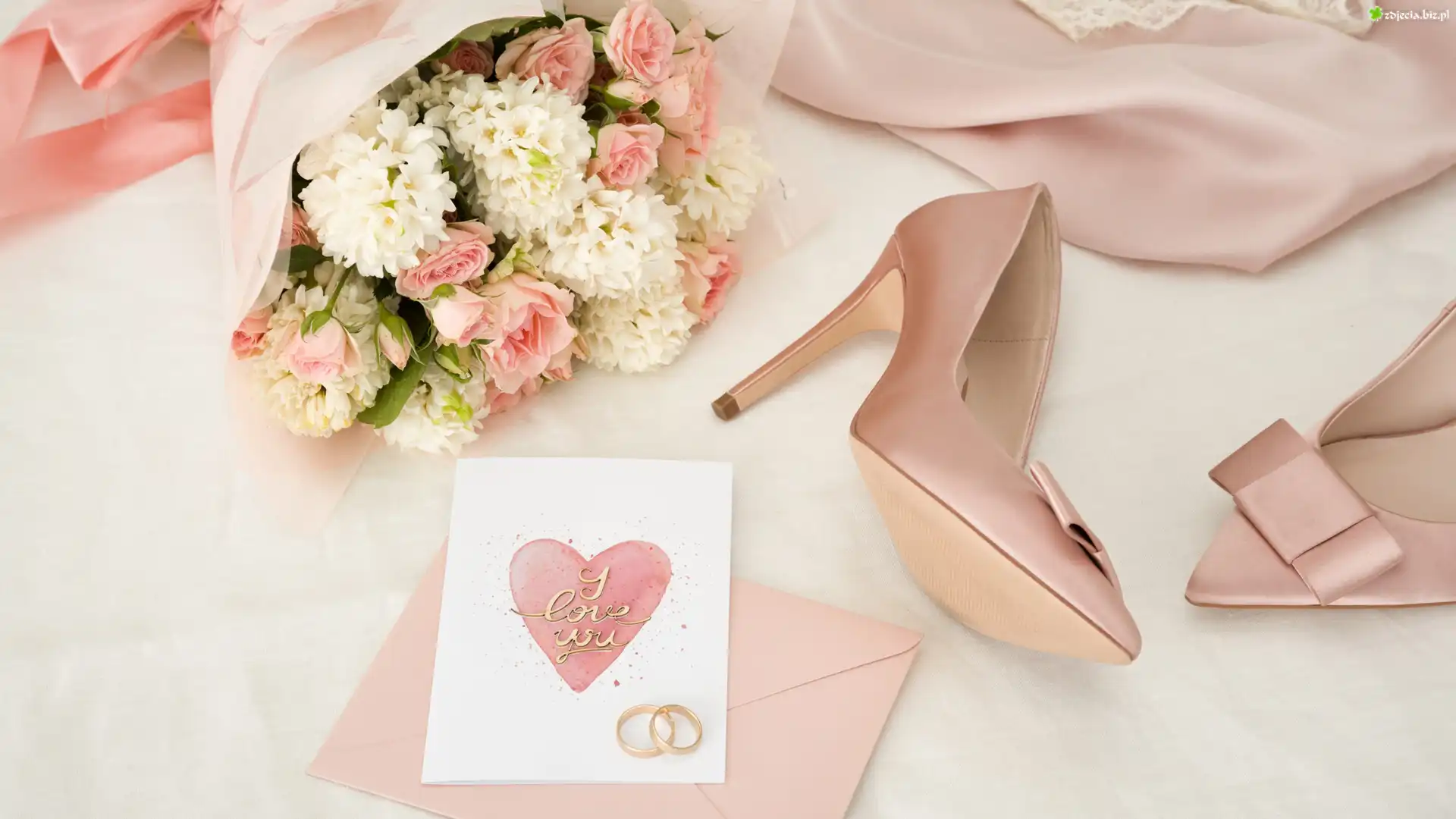 Zdjęcie Bukiet, Kwiaty, Szpilki, Koperta, Kartka, Obrączki, Miłość, Ślub