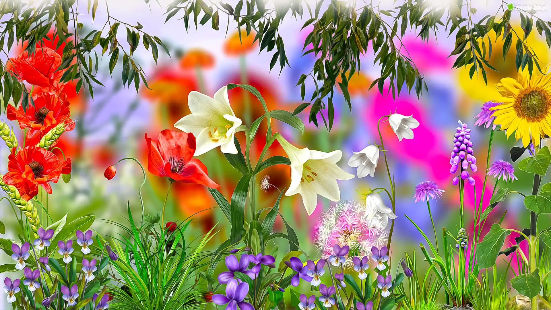 Zdjęcie Kwiaty, Lilie, Słonecznik, Maki, Grafika
