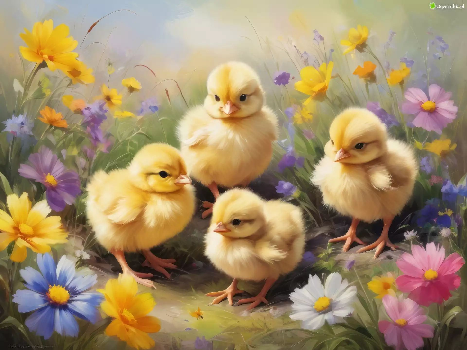 Zdjęcie Małe, Żółte, Kurczęta, Kwiaty