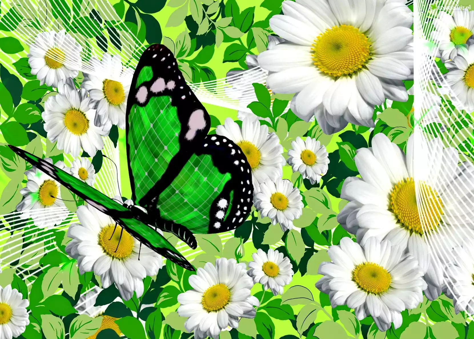 Zdjęcie Kwiaty, Rumianek, Zielony, Motyl, Grafika