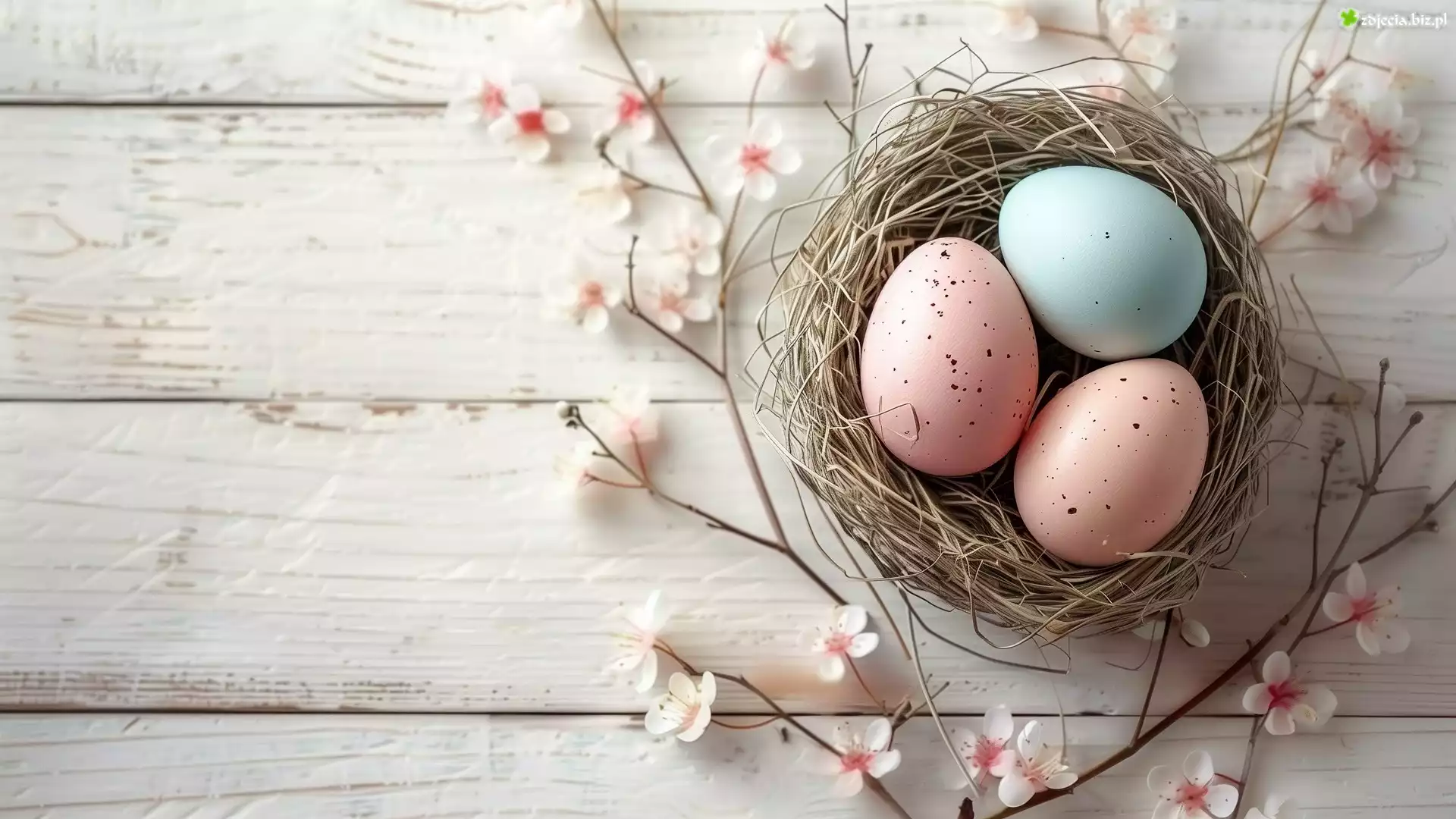 Zdjęcie Wielkanoc, Różowe, Niebieskie, Pisanki, Gniazdo, Gałązki, Białe, Kwiaty