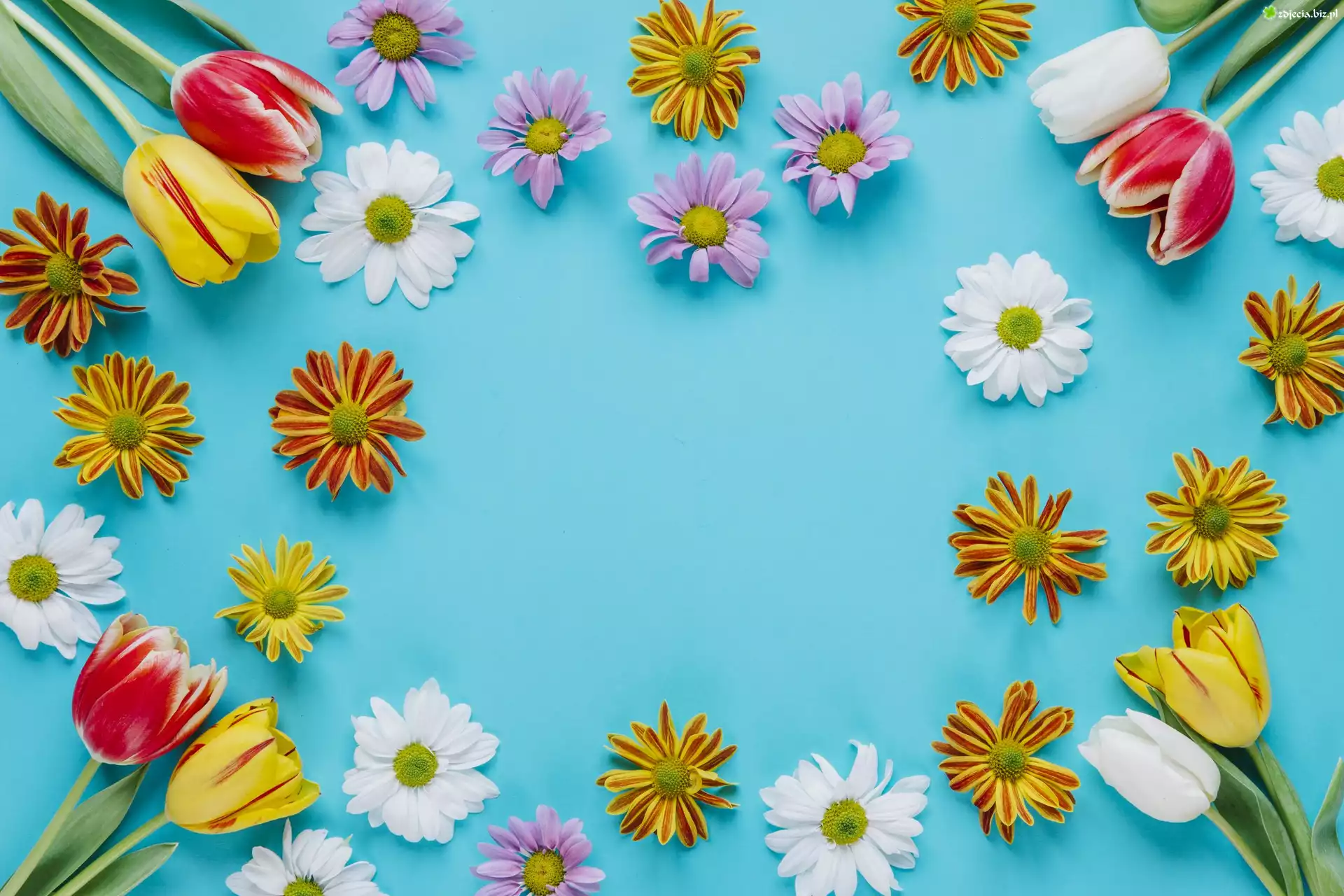 Zdjęcie Kwiaty, Kolorowe, Tulipany, Chryzantemy, Niebieskie, Tło