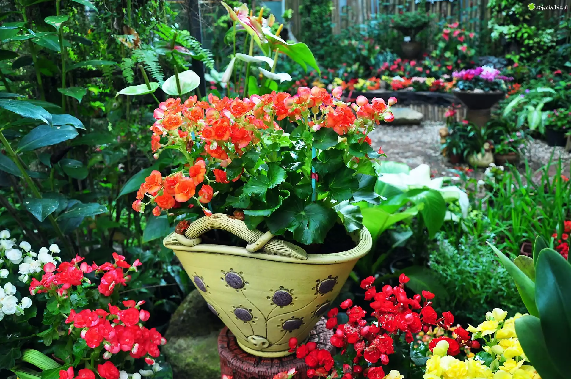 Zdjęcie Kwiaty, Begonie, Waza, Ogród, Staw