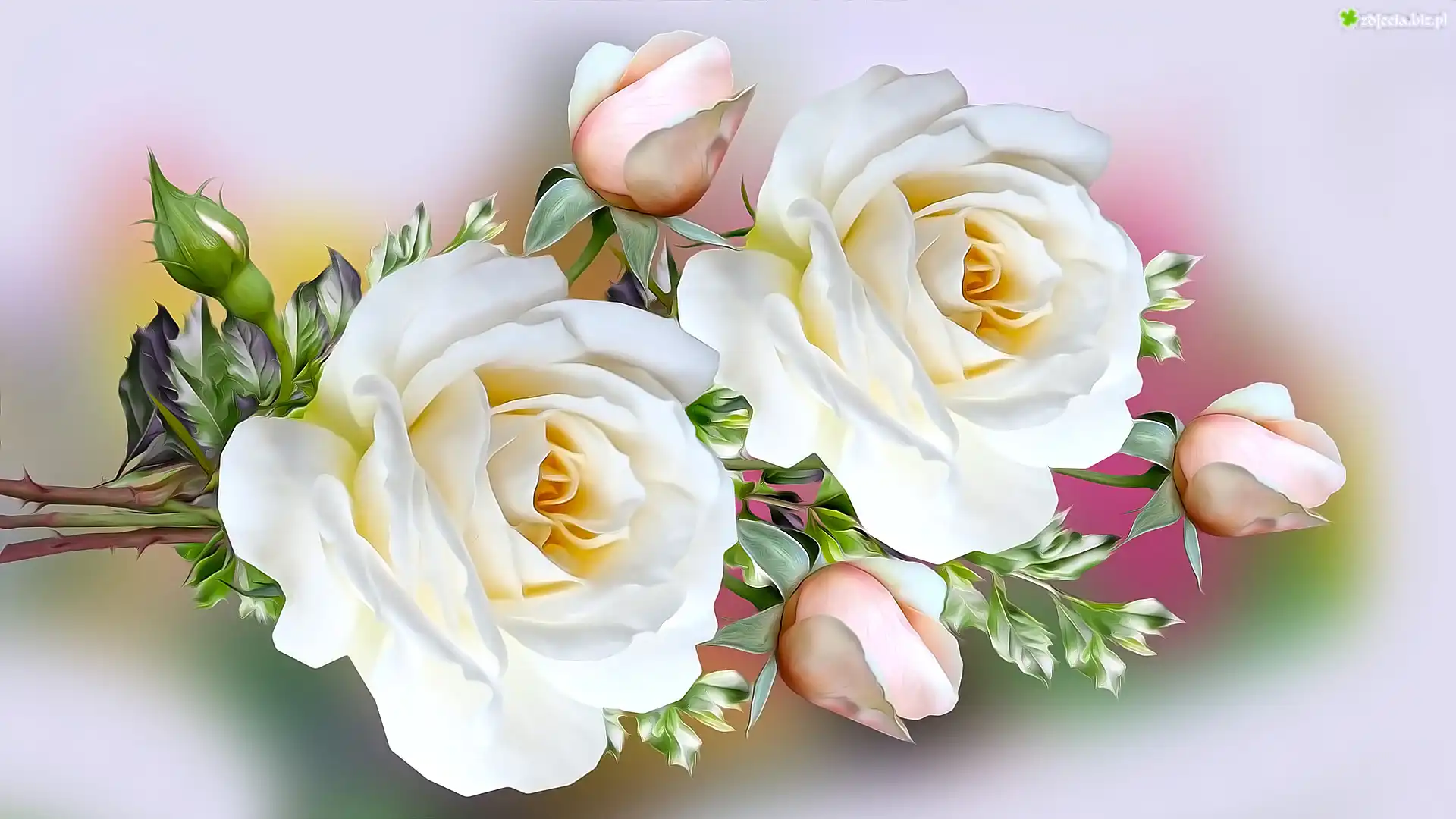 Zdjęcie Kwiaty, Białe, Dwie, Róże, Pąki, Grafika