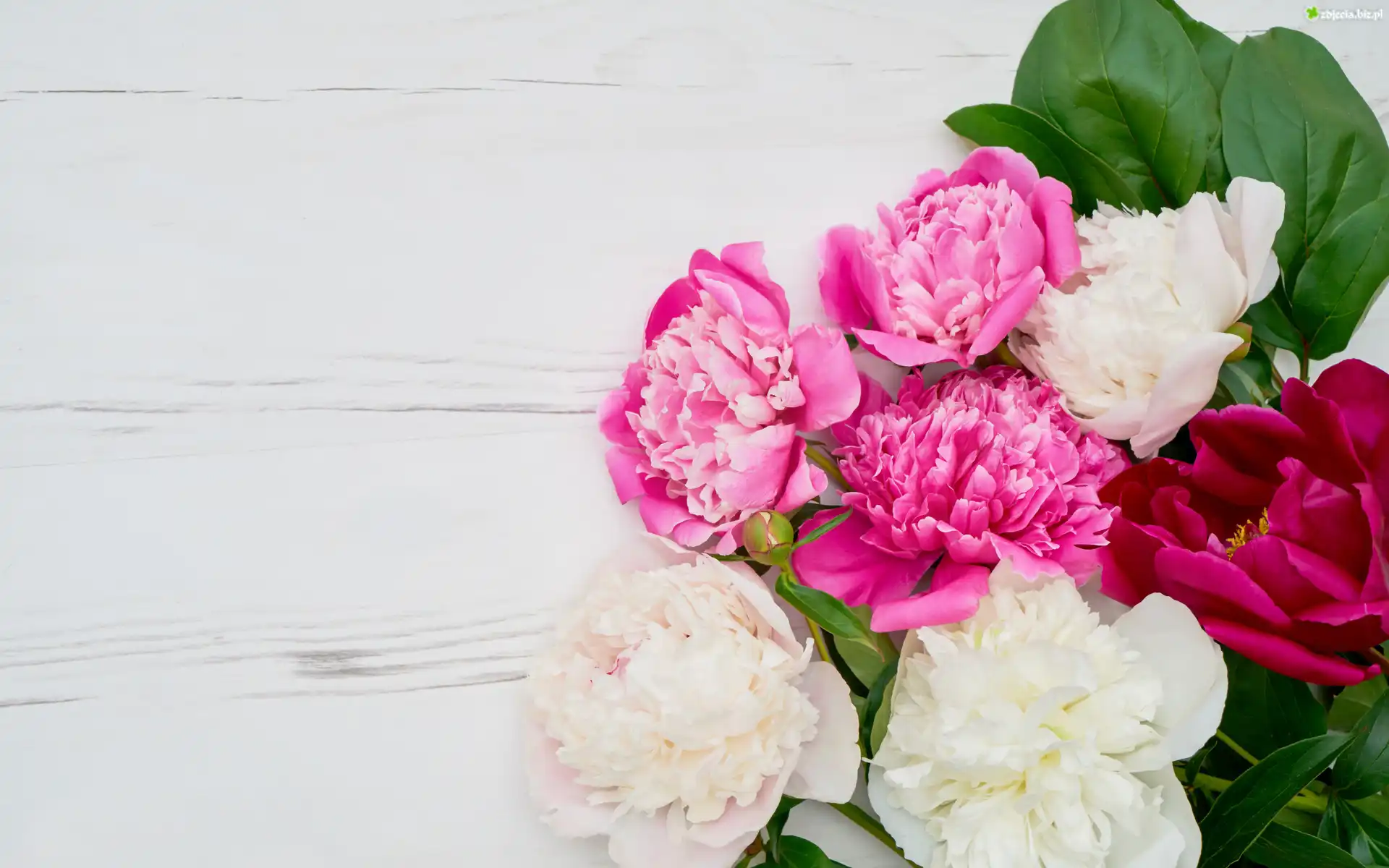 Zdjęcie Kwiaty, Białe, Różowe, Piwonie, Listki