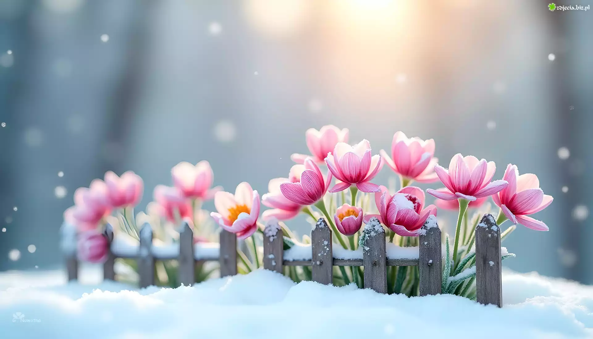 Zdjęcie Różowe, Kwiaty, Płotek, Śnieg, Grafika