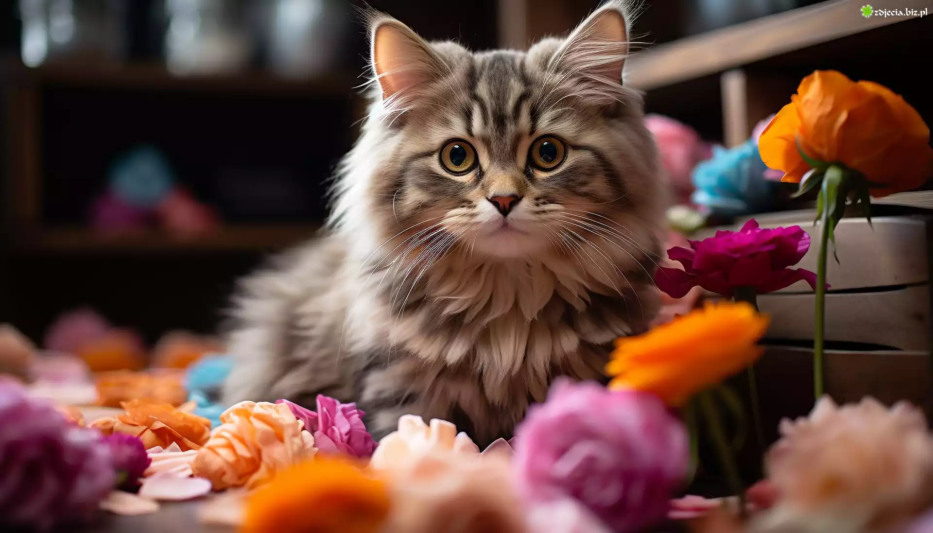 Zdjęcie Puszysty, Kot, Kolorowe, Kwiaty