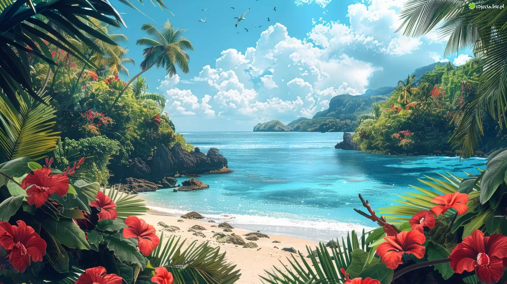 Zdjęcie, Morze. Plaża, Palmy, Kwiaty, Hibiskus, Roślinność