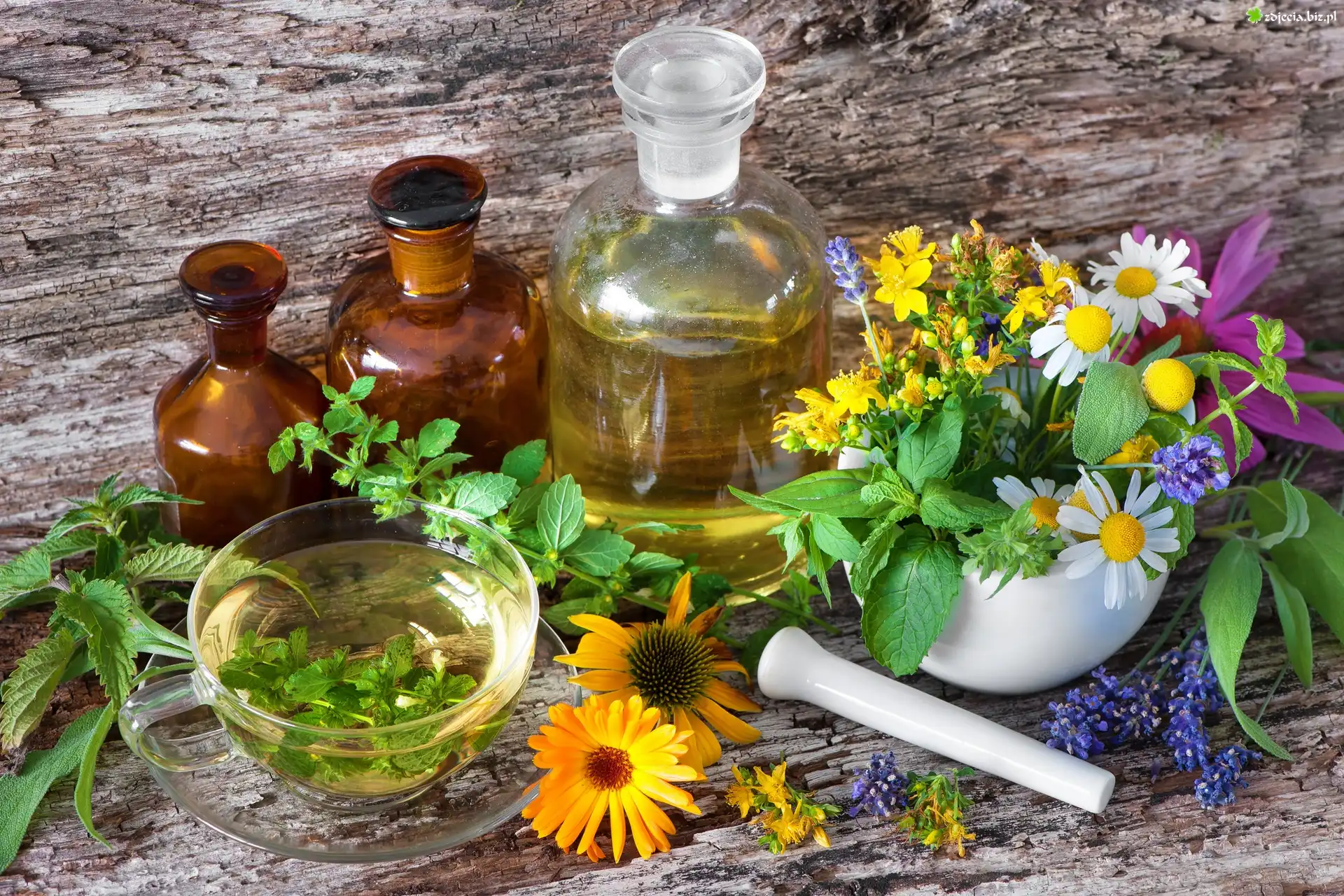 Zdjęcie Rośliny, Kwiaty, Zioła, Olejki, Buteleczki, Filiżanka, Kompozycja